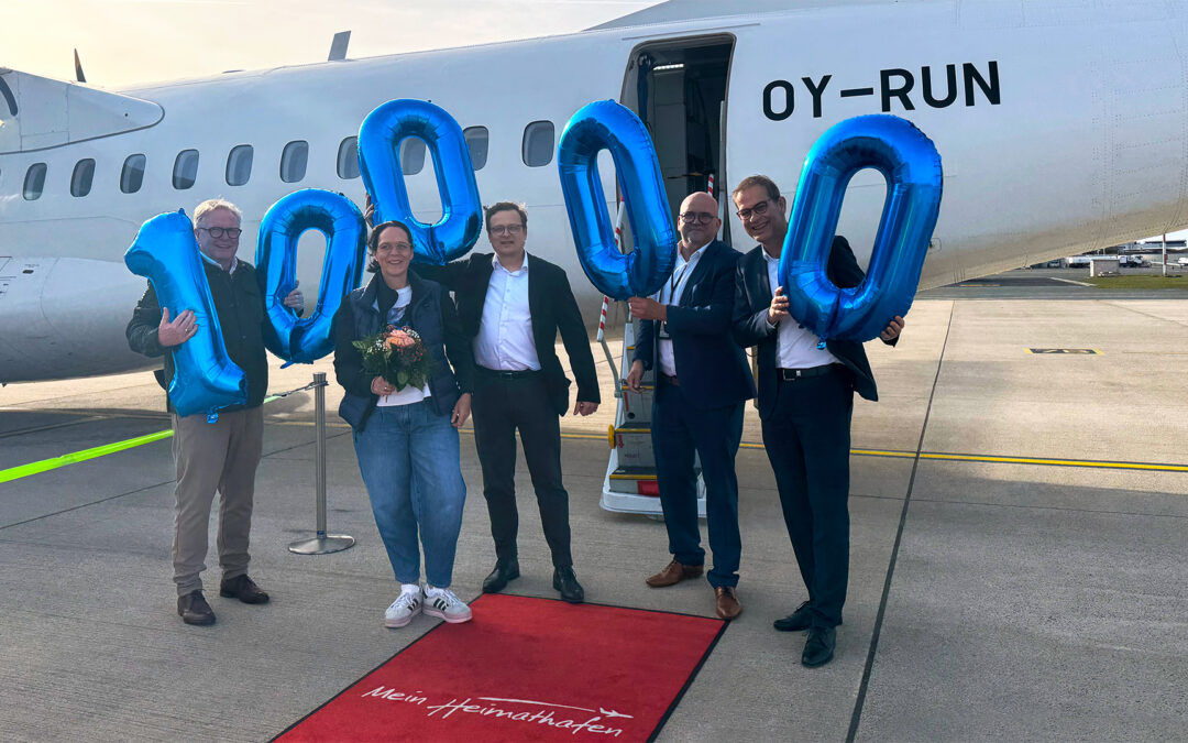 Große Freude bei den skyhub PAD-Verantwortlichen mit dem Jubiläumsfluggast (von links): Geschäftsführer Klaus Marx, Sabine Gödde, Kaufmännischer Leiter Andreas Böttcher, Flughafen-Geschäftsführer Roland Hüser und Beiratsvorsitzender Christoph Plass.